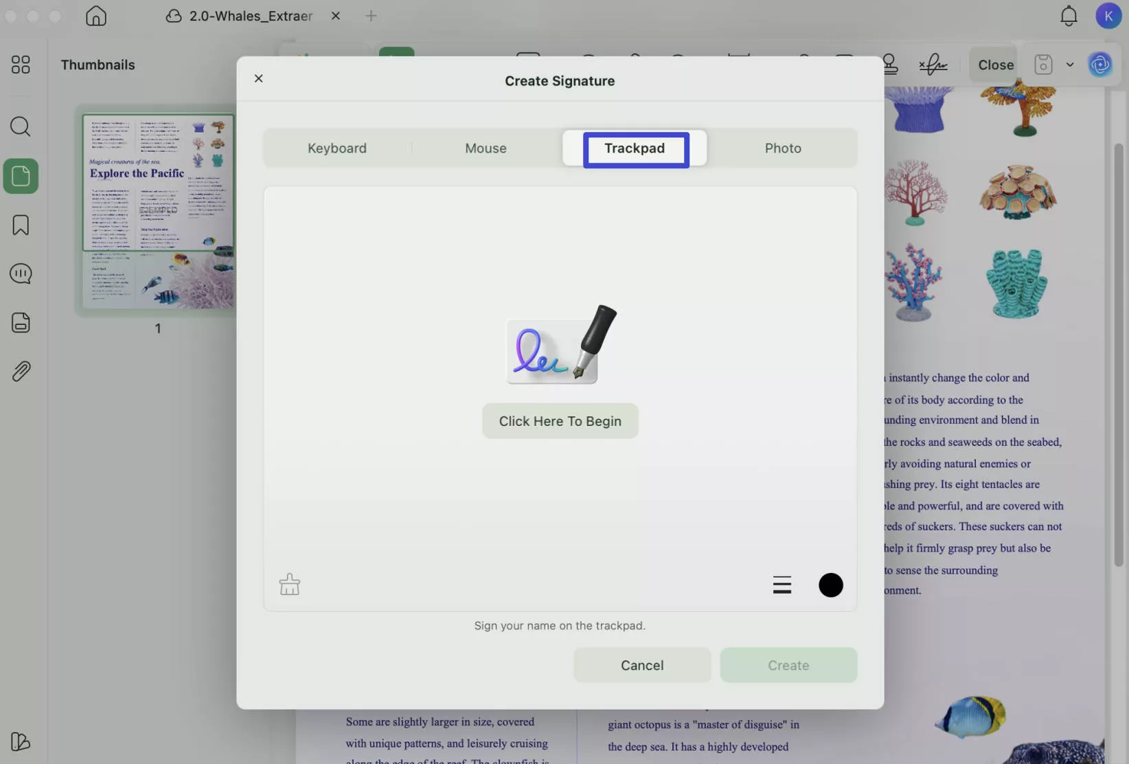 Select the input source from the top left corner of the popup window. If you use a laptop, "Trackpad” will be the right option. Now, click the "Click Here to Begin" button. Carefully sign on your laptop's trackpad, which will appear in the UPDF window. Press any key on the keyboard when you are done. If you are satisfied with the signature, you may click "Create;" otherwise, click "Cancel” and start over by clicking “Click Here to Begin."