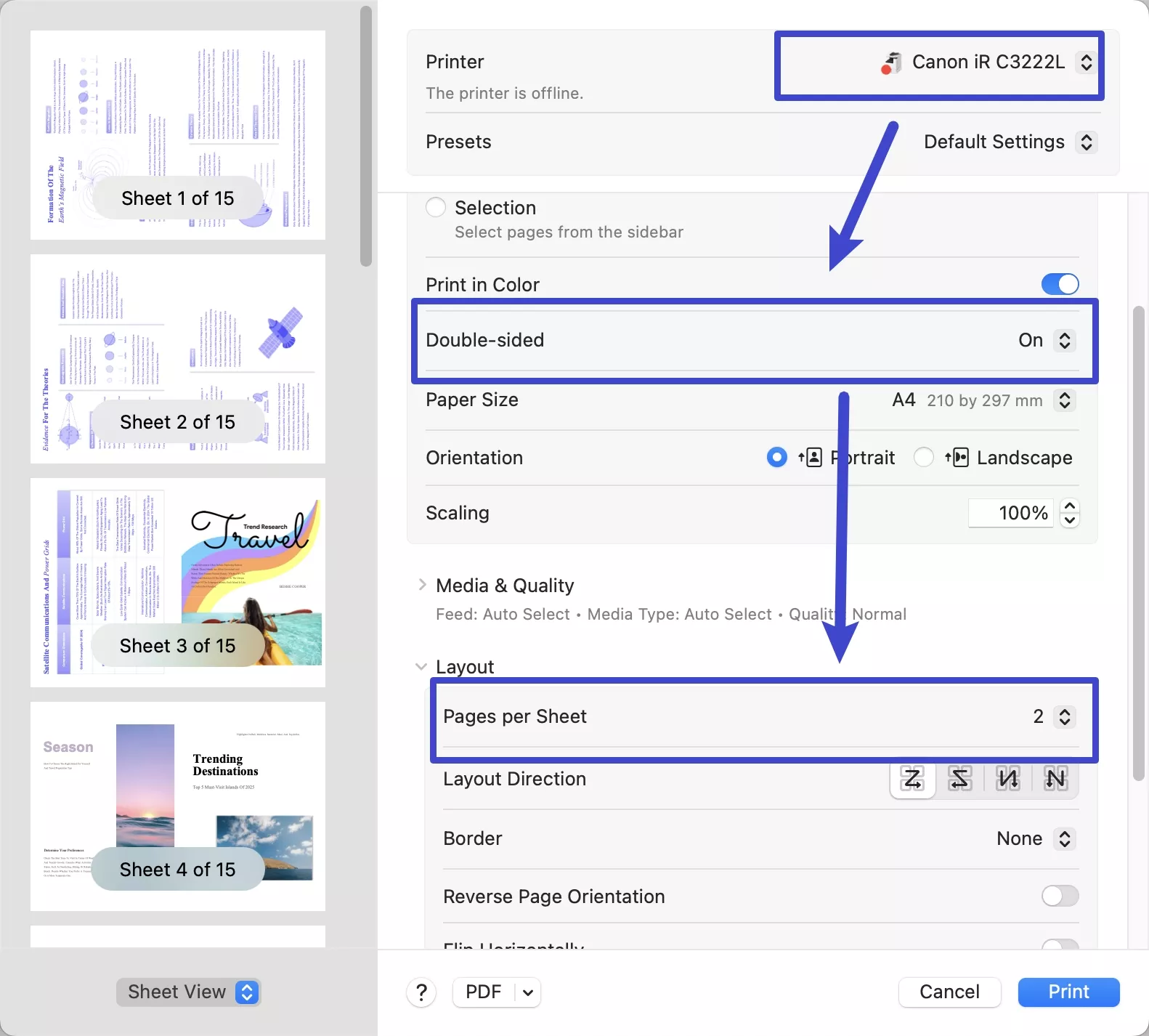 On the Print setting window, select your printer. Now, choose "On" in the "Double Sided". Go to the Layout section and click to open it. Now, choose "2" in the Pages per Sheet.