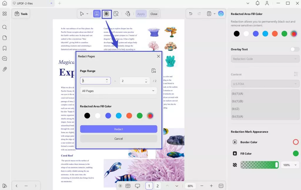 You can also redact pages with UPDF. Click on the "Redact Pages" icon. Select the page range, choose the color, and click on the "Redact" to check the effect. Then, click on the "Apply" and save the changes.